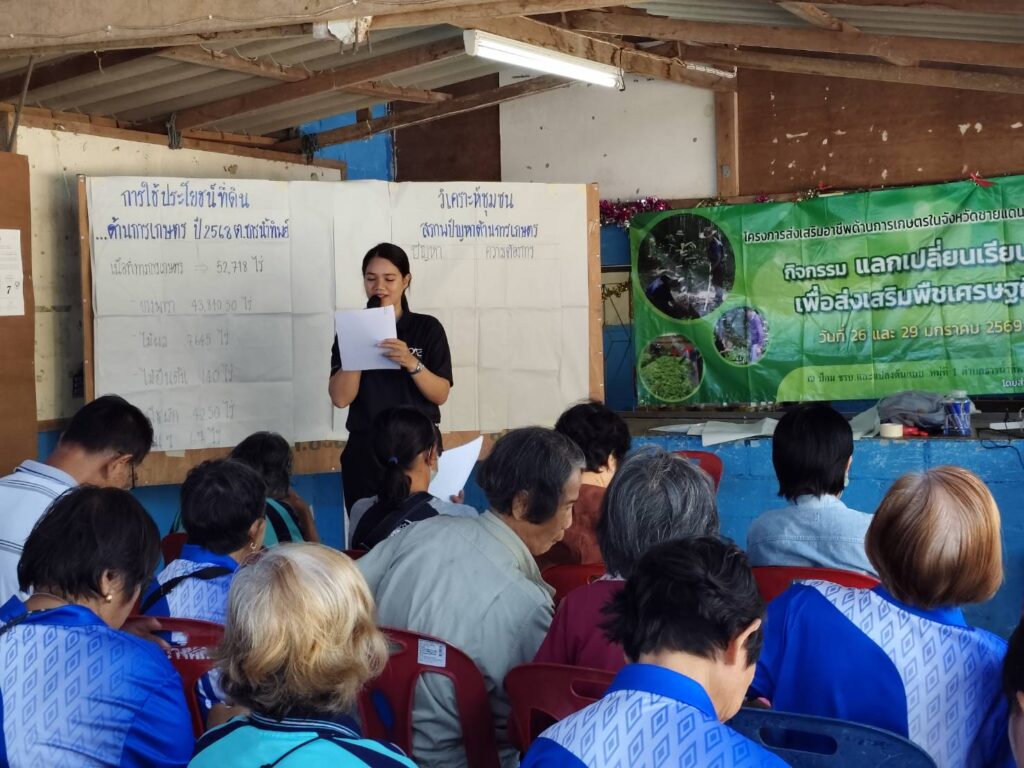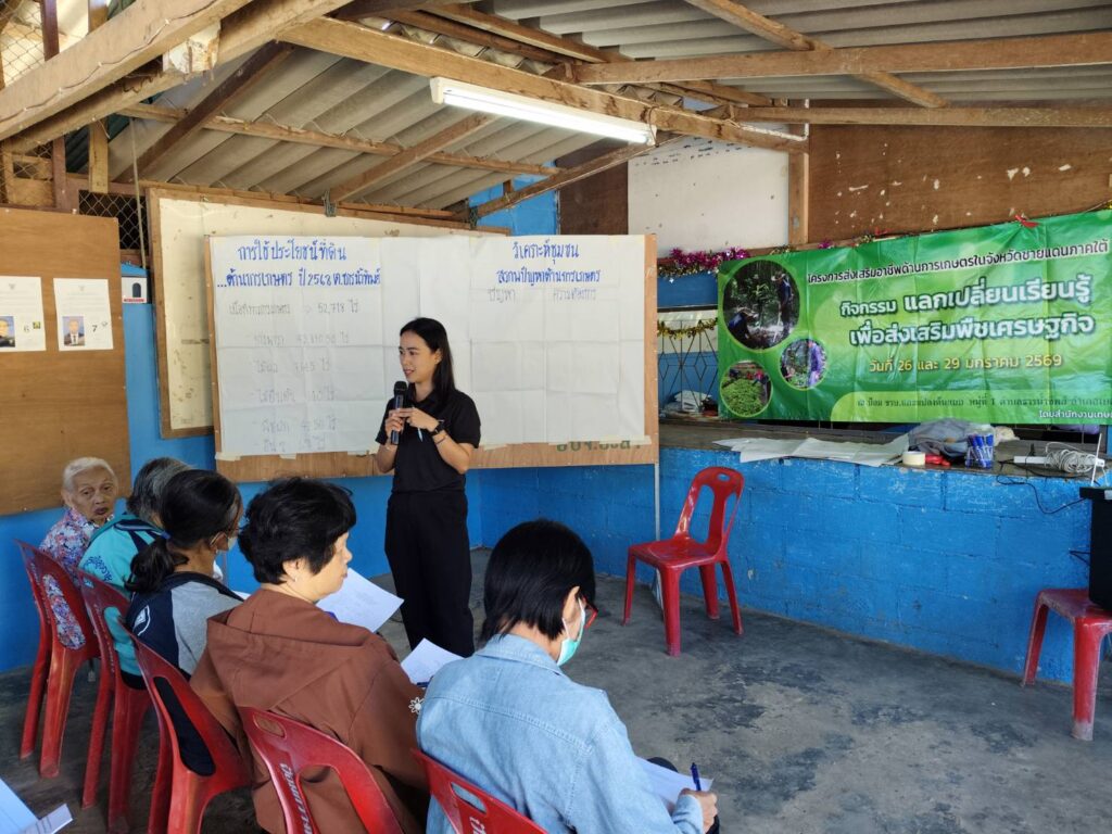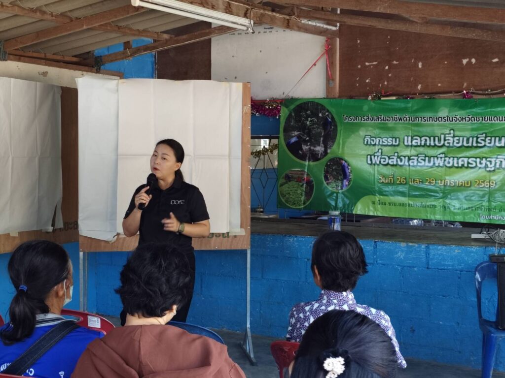 วันที่ 26 และ 29 มกราคม 2569 นางสาวอาภรณ์ รัตนพิบูลย์ เกษตรอำเภอเบตง พร้อมด้วยเจ้าหน้าที่สำนักงานเกษตรอำเภอเบตง จัดเวทีแลกเปลี่ยนเรียนรู้เพื่อส่งเสริมพืชเศรษฐกิจ ภายใต้โครงการส่งเสริมอาชีพด้านการเกษตรในจังหวัดชายแดนภาคใต้ ซึ่งมีวัตถุประสงค์เพื่อพัฒนาอาชีพทางการเกษตรในพื้นที่ และส่งเสริมการทำการเกษตรเพื่อรองรับการพัฒนาเศรษฐกิจในพื้นที่จังหวัดชายแดนภาคใต้ โดยได้วิเคราะห์ชุมชนเพื่อส่งเสริมอาชีพด้านการเกษตรวางแผนรองรับการพัฒนาเศรษฐกิจ วิเคราะห์ปัญหาและวางแผนการส่งเสริมการเกษตรเชิงพื้นที่เพื่อพัฒนาเศรษฐกิจระยะ 3 ปี การถ่ายทอดความรู้เรื่องการผสมปุ๋ยใช้เองเพื่อลดต้นทุนการผลิต พร้อมทั้งสาธิตการผสมปุ๋ยใช้เองเพื่อลดต้นทุนการผลิต โดยเจ้าหน้าที่จากสถานีพัฒนาที่ดินยะลา การถ่ายทอดความรู้เรื่องการผลิตทุเรียนคุณภาพ โดยคุณสุริยันต์ จันทรมณี พร้อมกันนี้ได้ศึกษาดูงานเพื่อแลกเปลี่ยนเรียนรู้การผลิตทุเรียนคุณภาพ ณ ป้อม ชรบ. และแปลงต้นแบบ หมู่ที่ 1 ตำบลธารน้ำทิพย์ อำเภอเบตง จังหวัดยะลา
