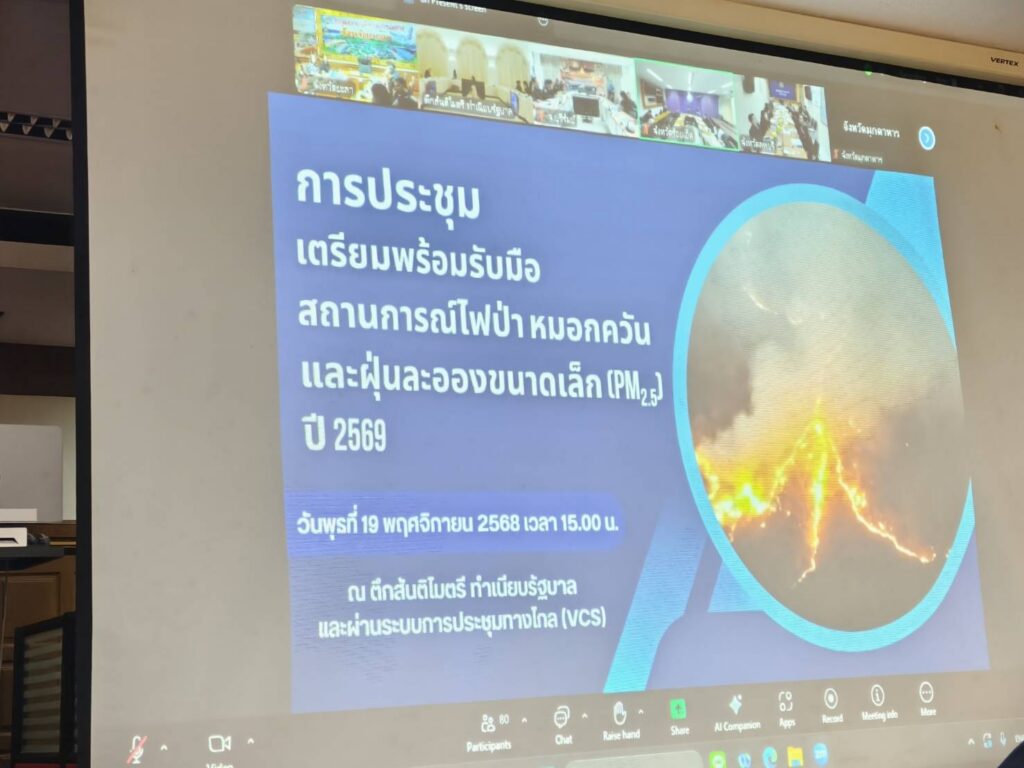 วันที่ 19 พฤศจิกายน 2568 นางวีระ สมศิริ หัวหน้ากลุ่มส่งเสริมและพัฒนาการผลิต รักษาราชการแทนเกษตรจังหวัดยะลา มอบหมายให้นางภาวิณี เพ็ชรรัตน์ นักวิชาการส่งเสริมการเกษตรชำนาญการ กลุ่มอารักขาพืช สำนักงานเกษตรจังหวัดยะลา เข้าร่วมประชุมเตรียมพร้อมรับมือสถานการณ์ไฟป่า หมอกควัน และฝุ่นละอองขนาดเล็ก (PM2.5) ปี 2569 ผ่านระบบการประชุมทางไกล (VCS) ณ ห้องประชุมพิกุล ชั้น 3 อาคาร 3 ศาลากลางจังหวัดยะลา