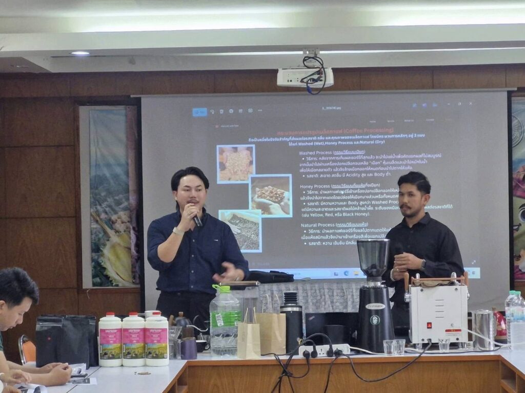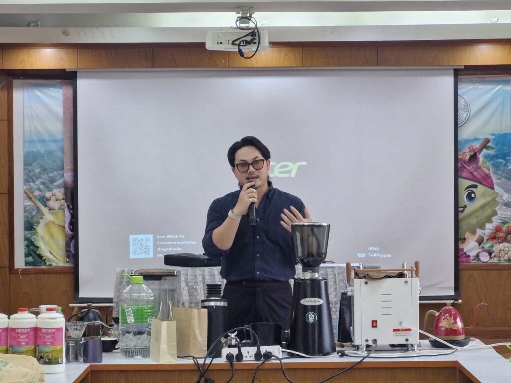 วันที่ 20 พฤศจิกายน 2568 นางวีระ สมศิริ หัวหน้ากลุ่มส่งเสริมและพัฒนาการผลิต รักษาราชการแทนเกษตรจังหวัดยะลา มอบหมายให้นางสาวศศิภา แก้วศรีสุข นักวิชาการส่งเสริมการเกษตรชำนาญการ กลุ่มส่งเสริมและพัฒนาเกษตรกร สำนักงานเกษตรจังหวัดยะลา จัดอบรมกิจกรรมส่งเสริมและพัฒนาต่อยอดผลิตภัณฑ์จากเมล็ดกาแฟ โครงการเพิ่มประสิทธิภาพการผลิตและการแปรรูปกาแฟ ประจำปีงบประมาณ พ.ศ 2569 โดยมีวัตถุประสงค์เพื่อพัฒนาความรู้ ความสามารถ ทักษะในการเพิ่มประสิทธิภาพการผลิตและการแปรรูปกาแฟให้เกษตรกรสามารถนำไปปรับใช้และปฏิบัติในพื้นที่ เป้าหมายเกษตรกรผู้ปลูกกาแฟ จำนวน 25 ราย ณ ห้องประชุม 3 สำนักงานเกษตรจังหวัดยะลา