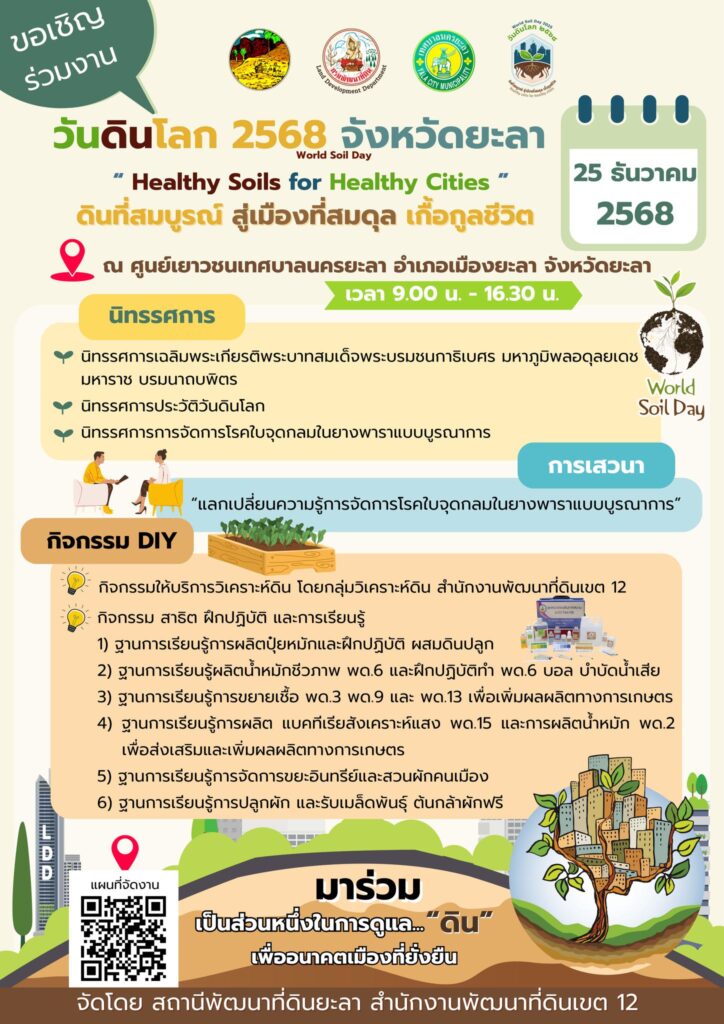 ทั้งนี้ ได้ประชาสัมพันธ์การจัดงานโครงการวันดินโลก ประจำปี 2568 จังหวัดยะลา ภายใต้หัวข้อ “Healthy Soils for Healthy Cities : ดินที่สมบูรณ์ สู่เมืองที่สมดุล เกื้อกูลชีวิต” โดยมีกำหนดจัดขึ้นในวันที่ 25 ธันวาคม 2568 ณ ศูนย์เยาวชนเทศบาลนครยะลา อำเภอเมืองยะลา จังหวัดยะลา