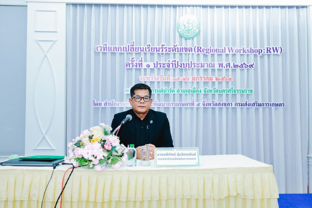 วันที่ 15 – 16 มกราคม 2569 นางวีระ สมศิริ เกษตรจังหวัดยะลา มอบหมายให้หัวหน้ากลุ่ม และผู้แทนหัวหน้ากลุ่ม เข้าร่วมร่วมเวทีแลกเปลี่ยนเรียนรู้ระดับเขต (Regional Workshop : RW) ครั้งที่ 1 ประจำปีงบประมาณ พ.ศ. 2569 โดยมี นายรพีทัศน์ อุ่นจิตตพันธ์ รองอธิบดีกรมส่งเสริมการเกษตร เป็นประธานในพิธี ณ โรงแรมแกรนด์ปาร์ค อำเภอเมืองนครศรีธรรมราช จังหวัดนครศรีธรรมราช
