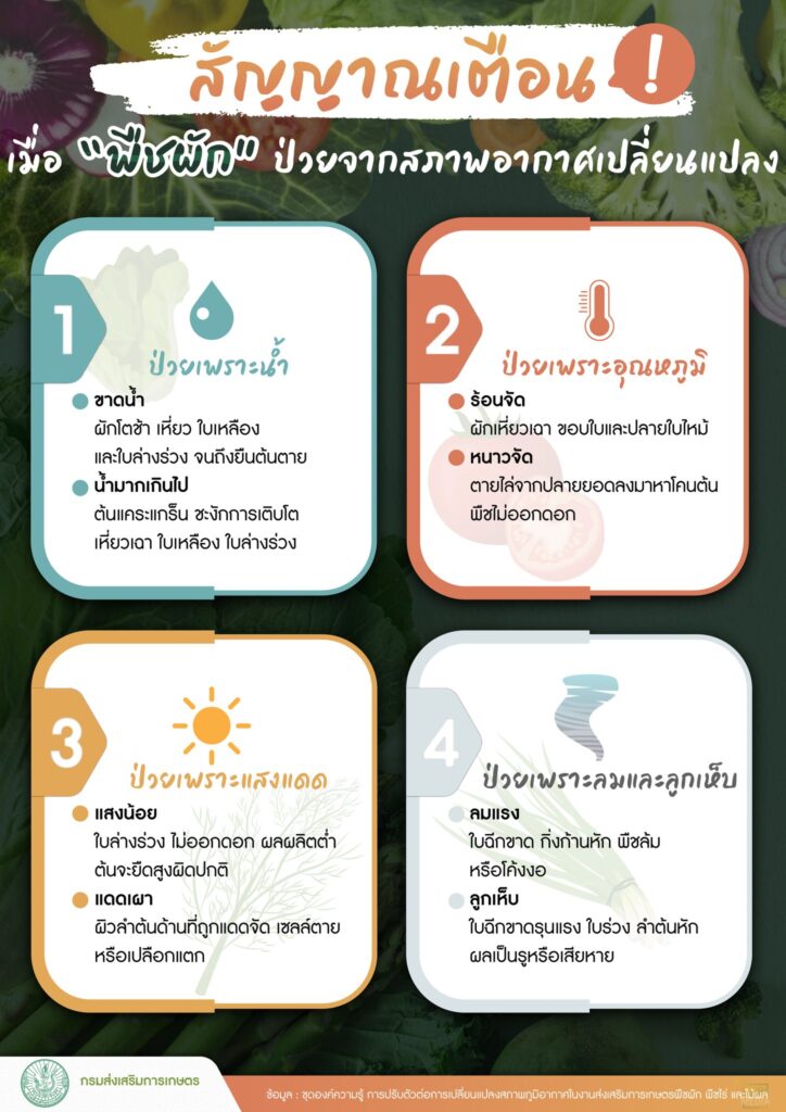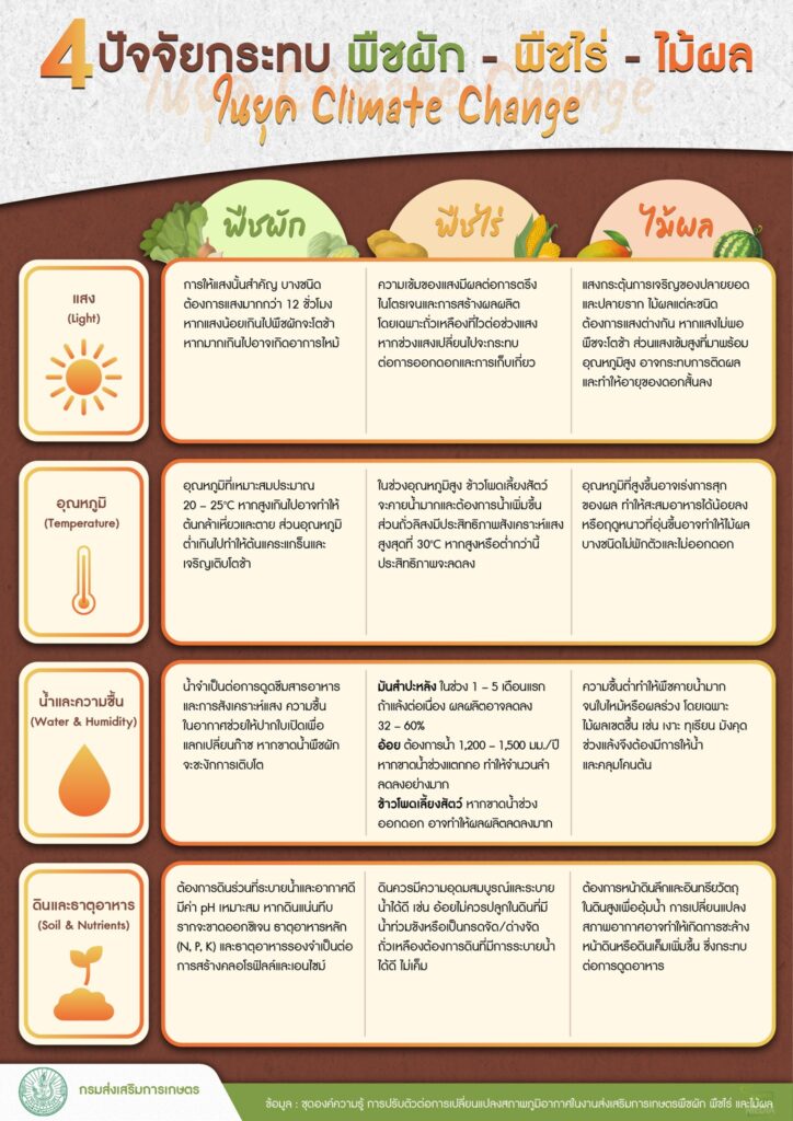 ภายในรายการได้หยิบยกประเด็น การเปลี่ยนแปลงสภาพภูมิอากาศ (Climate Change) ซึ่งส่งผลกระทบต่อภาคการเกษตรอย่างชัดเจน โดยเฉพาะฤดูร้อนปี 2569 ที่มีแนวโน้มอุณหภูมิสูงขึ้น ปริมาณฝนต่ำกว่าค่าปกติ และมีความเสี่ยงจากพายุฤดูร้อน ภัยแล้ง ไฟป่า และคลื่นความร้อน ซึ่งล้วนส่งผลต่อพืชเศรษฐกิจทั้งพืชผัก พืชไร่ และไม้ผล ซึ่งมี 4 ปัจจัยสำคัญที่เกษตรกรต้องจับตามอง อาทิ อุณหภูมิที่สูงขึ้น ความแปรปรวนของปริมาณฝน ระยะเวลาแล้งที่ยาวนาน และเหตุการณ์สภาพอากาศสุดขั้ว พร้อมอธิบายผลกระทบต่อการเจริญเติบโตของพืชในแต่ละช่วง ตั้งแต่ระยะปลูกการดูแลรักษา ไปจนถึงการให้ผลผลิต นอกจากนี้ ยังได้ให้คำแนะนำแนวทางการปรับตัวของเกษตรกรในการดูแลพืชผักและพืชไร่เศรษฐกิจสำคัญ เช่น การเลือกพันธุ์ที่เหมาะสม การปรับปฏิทินการเพาะปลูก การจัดการดินและน้ำอย่างมีประสิทธิภาพ รวมถึงการเฝ้าระวังความเสี่ยงจากทั้งภัยแล้งและน้ำท่วม เพื่อช่วยลดความเสียหายและรักษาคุณภาพผลผลิตให้ยั่งยืน