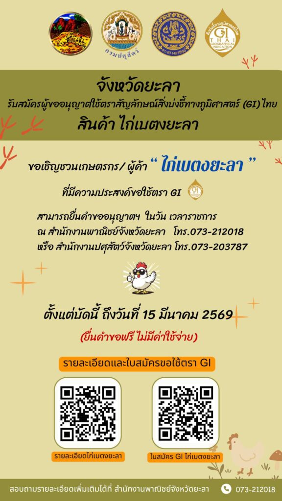 📌📌 จังหวัดยะลา เชิญชวนเกษตรกร ผู้ค้า ไก่เบตงยะลา ที่มีความประสงค์ขอใช้ตราสิ่งบ่งชี้ทางภูมิศาสตร์ (GI) ไทย สามารถยื่นคำขออนุญาตฯ ในวัน เวลาราชการ ณ สำนักงานพาณิชย์จังหวัดยะลา โทร.073-212018