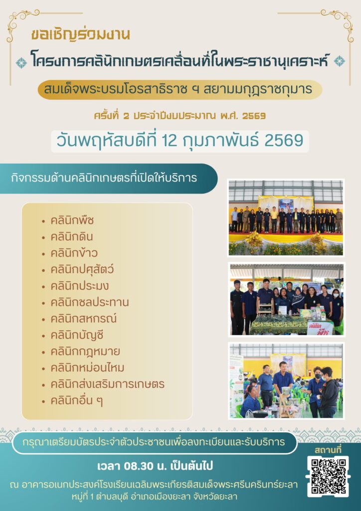 ประชาสัมพันธ์ขอเชิญร่วมงาน โครงการคลินิกเกษตรเคลื่อนที่ในพระราชานุเคราะห์ สมเด็จพระบรมโอรสาธิราช ฯ สยามมกุฎราชกุมาร จังหวัดยะลา ครั้งที่ 2/2569 admin_doae / 11 กุมภาพันธ์ 2026 ขอเชิญร่วมงาน โครงกา