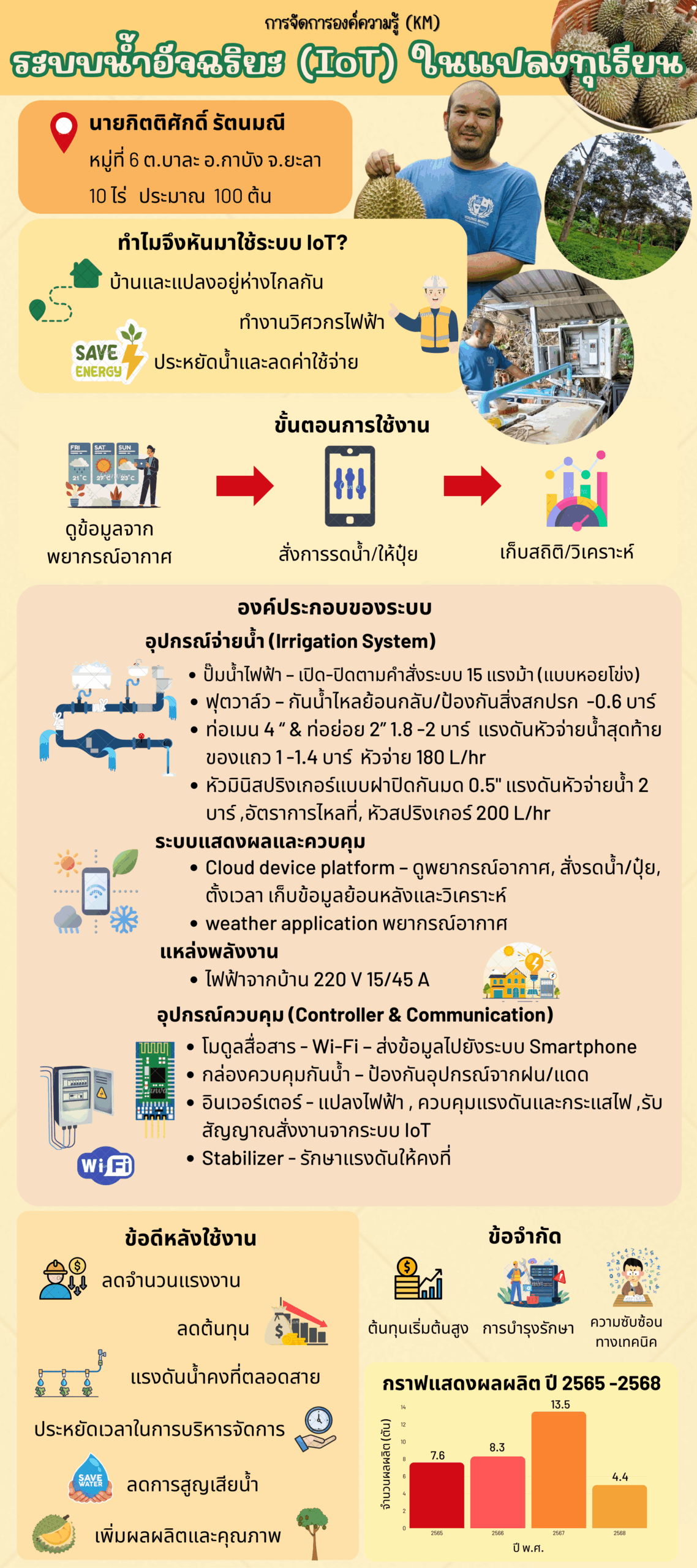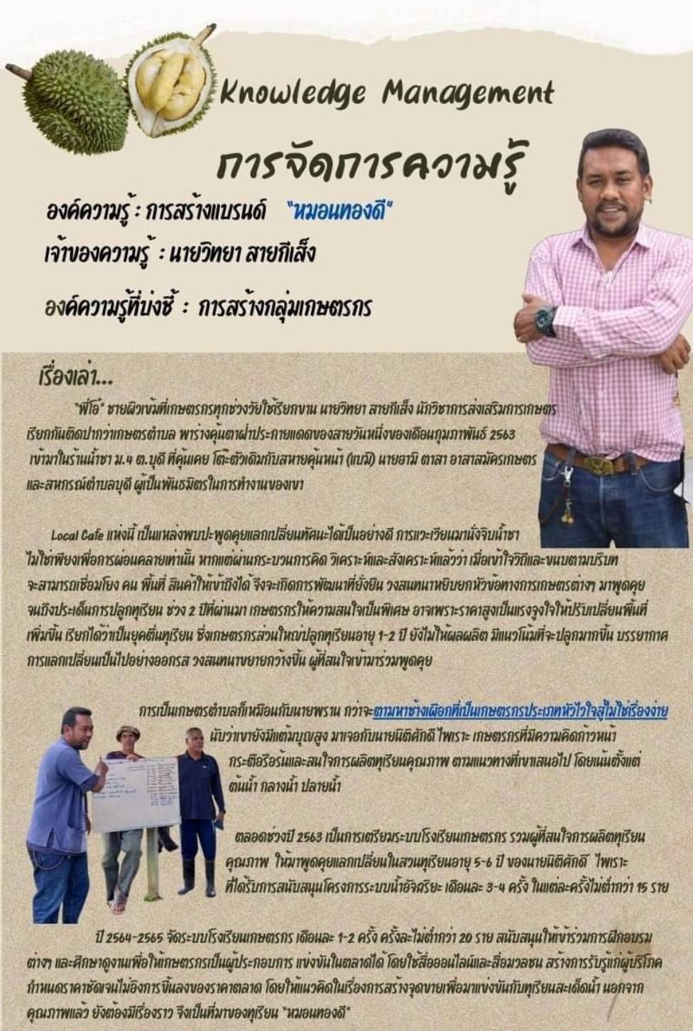 การจัดการความรู้ (KM) ปี 2566 การสร้างเเบนด์หมอนทองดี ปี 2567 การขับเคลื่อนเพื่อยกระดับการผลิตทุเรียน ปี 2568 ระบบน้ำอัจฉริยะ