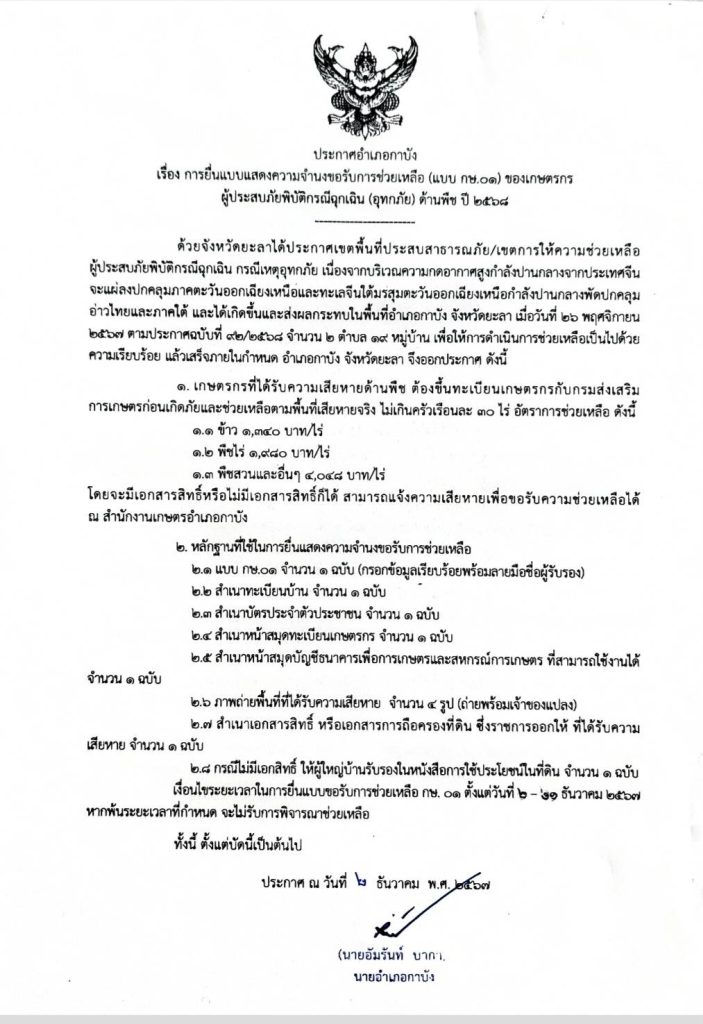 เรื่อง การยื่นแบบแสดงความจำนงขอรับการช่วยเหลือ (แบบ กษ.01) ของเกษตรกรผู้ประสบภัยพิบัติกรณีฉุกเฉิน (อุทกภัย) ด้านพืช ปี 2568 แนะแนวเรื่อง เกษตรกาบัง ประชุมสำนักงานเกษตรอำเภอประจำเดือนครั้งที่ 11/67 เกษตรกาบัง ติดตามและเยี่ยมเยียนแปลงต้นแบบใช้แสงไฟเพื่อไล่และล่อผีเสื้อกลางคืน ป้องกันวางไข่บนหนอนเจาะเมล็ดทุเรียน