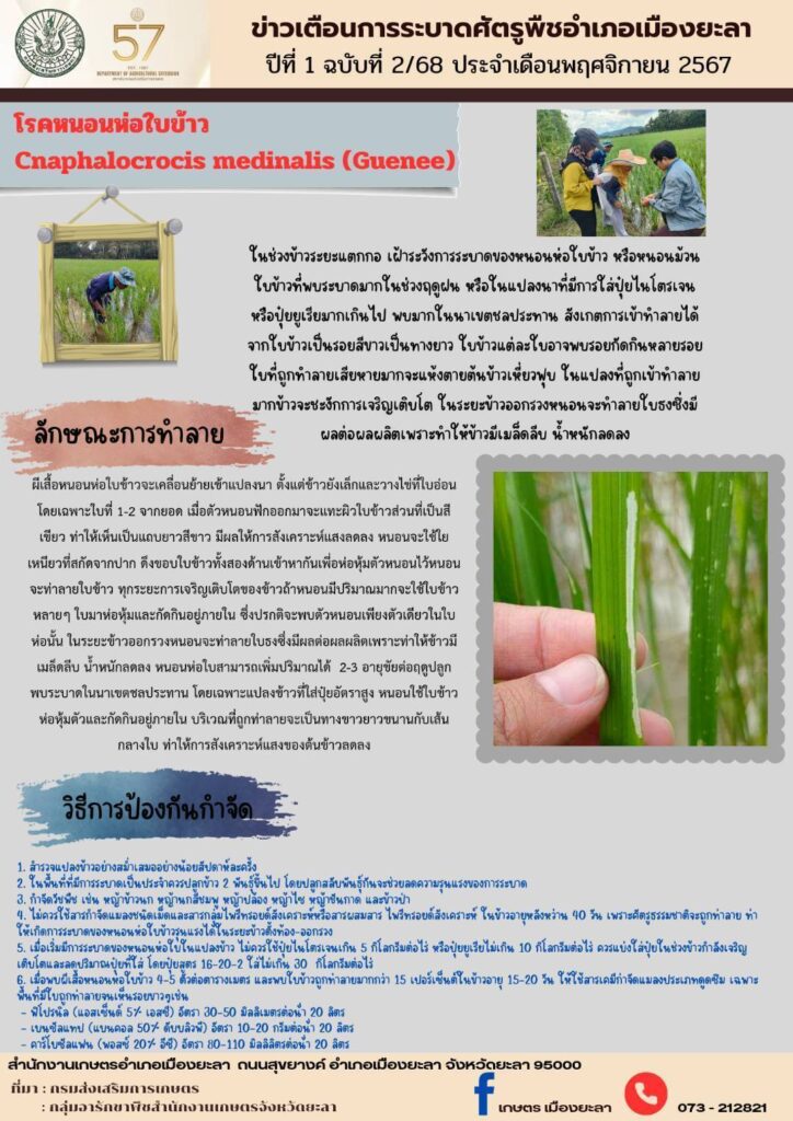 ข่าวเตือนการระบาดศัตรูพืชอำเภอเมืองยะลา ปีที่ 1 ฉบับที่ 2/68By admin_doae / 30 มกราคม 2026 โรคหนอนห่อใบข้าว