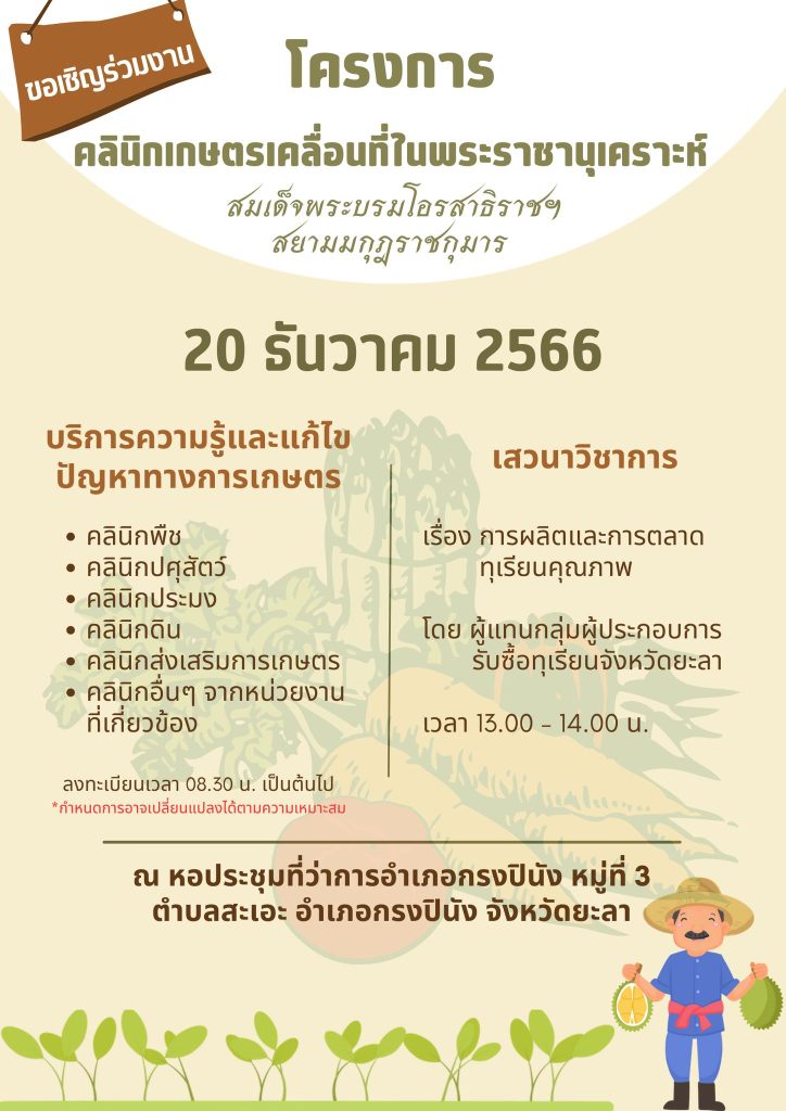 ทั้งนี้ ได้ประชาสัมพันธ์เงื่อนไขโครงการสนับสนุนค่าบริหารจัดการและพัฒนาคุณภาพผลผลิตเกษตรกรผู้ปลูกข้าว ปีการผลิต 2566/67 และโครงการคลินิกเกษตรเคลื่อนที่ในพระราชานุเคราะห์ สมเด็จพระบรมโอรสาธิราชฯ สยามมกุฎราชกุมาร ครั้งที่ 1 ประจำปีงบประมาณ พ.ศ. 2567 ซึ่งมีกำหนดจัดขึ้นในวันที่ 20 ธันวาคม 2566 โดยภายในงานมีบริการคลินิกเกษตรเคลื่อนที่ ได้แก่ คลินิกพืช คลินิกดิน คลินิกสัตว์ คลินิกประมง เป็นต้น เป็นการร่วมบูรณาการระหว่างหน่วยงานสังกัดกระทรวงเกษตรและสหกรณ์ ส่วนราชการ รัฐวิสาหกิจ และหน่วยงานที่เกี่ยวข้อง เพื่อให้บริการประชาชน ณ หอประชุมที่ว่าการอำเภอกรงปินัง หมู่ที่ 3 ตำบลสะเอะ อำเภอกรงปินัง จังหวัดยะลา
