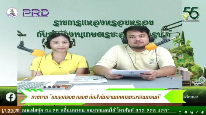 วันที่ 18 ธันวาคม 2566 นางสาวกิตติยา ศรีมณี นักวิชาการส่งเสริมการเกษตรปฏิบัติการ กลุ่มยุทธศาสตร์และสารสนเทศ พร้อมด้วย นายวันพิชิต สุขแก้ว กลุ่มส่งเสริมและพัฒนาการผลิต สำนักงานเกษตรจังหวัดยะลา จัดรายการ “แหลงหรอยหรอยกับสำนักงานเกษตรยะลา อินเทรนด์” ผ่านทางสถานีวิทยุกระจายเสียงแห่งประเทศไทยจังหวัดยะลา FM 94.25 MHz. ซึ่งออกอากาศทุกวันจันทร์ เวลา 11.10 – 12.00 น. และสามารถรับชมรายการสด (Live สด) หรือรับชมย้อนหลังผ่านทาง Facebook 94.25 คลื่นมหาชน คนชายแดนใต้ โดยมีประเด็นสร้างการรับรู้เรื่องการจัดการสวนไม้ผลช่วงหน้าฝน รวมทั้งได้เน้นย้ำการขึ้นทะเบียนเกษตรกรและปรับปรุงทะเบียนเกษตรกรของไม้ผล โดยเฉพาะทุเรียนซึ่งเป็นพืชเศรษฐกิจหลักของจังหวัดยะลา
