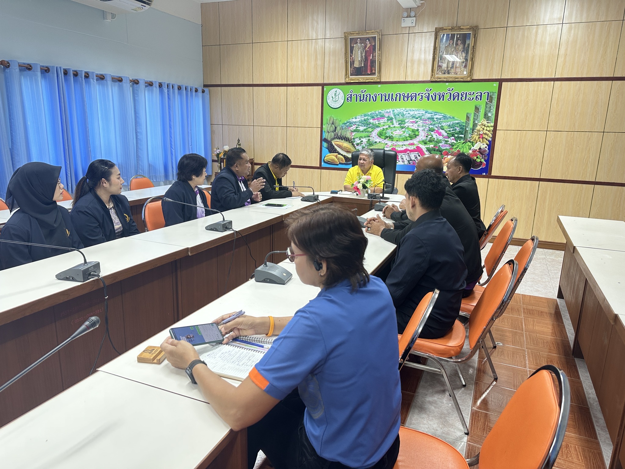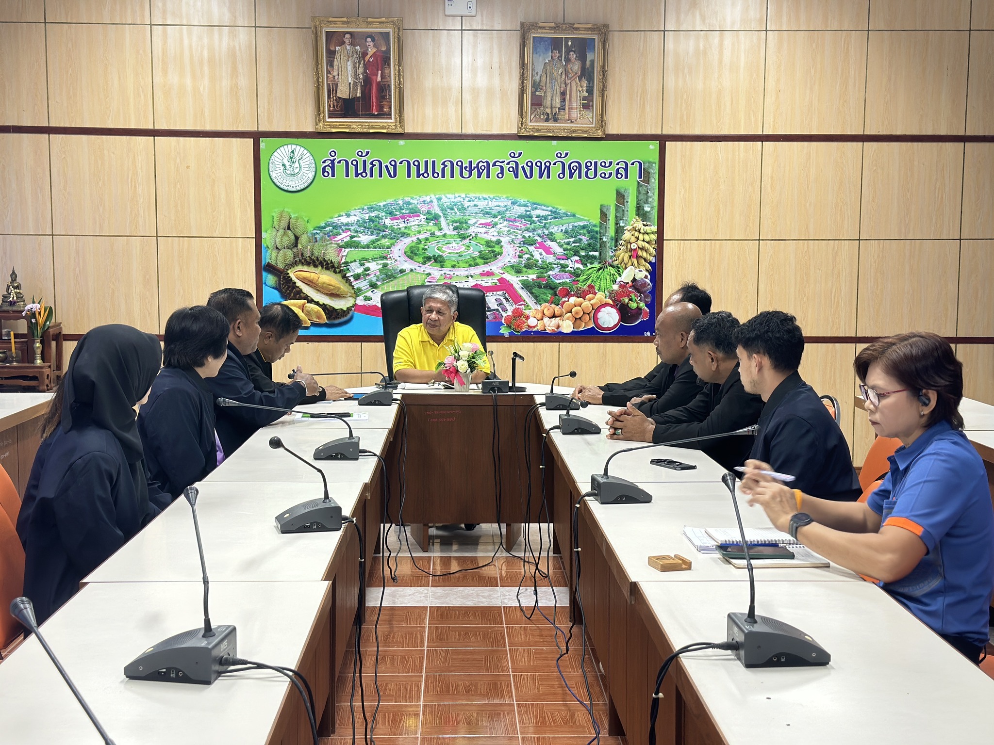 วันที่ 22 เมษายน 2568 นายกัสมัน ยะมาแล เกษตรจังหวัดยะลา ให้การต้อนรับ นางสาวธนิษฐา หนูสุข หัวหน้ากองทุนฟื้นฟูและพัฒนาเกษตรกรสาขาจังหวัดยะลา พร้อมคณะกรรมการกองทุนฟื้นฟูฯ เพื่อประชาสัมพันธ์งานของสำนักงานกองทุนฟื้นฟูและพัฒนาเกษตรกร เกี่ยวกับการฟื้นฟูและพัฒนาเกษตรกร การจัดการหนี้สินของเกษตรกร และร่วมกันบูรณาการขับเคลื่อนงานสถาบันเกษตรกร และวิสาหกิจชุมชน ของสำนักงานเกษตรจังหวัดยะลา เพื่อส่งเสริมและสนับสนุนการแก้ปัญหาด้านการเงินของกลุ่มเกษตรกร วิสาหกิจชุมชน รวมถึงการพัฒนาคุณภาพชีวิตและแก้ไขปัญหาหนี้สินของเกษตรกร เพื่อให้เกิดประโยชน์ต่อเกษตรกรจังหวัดยะลา ณ ห้องประชุม 1 สำนักงานเกษตรจังหวัดยะลา อำเภอเมืองยะลา จังหวัดยะลา