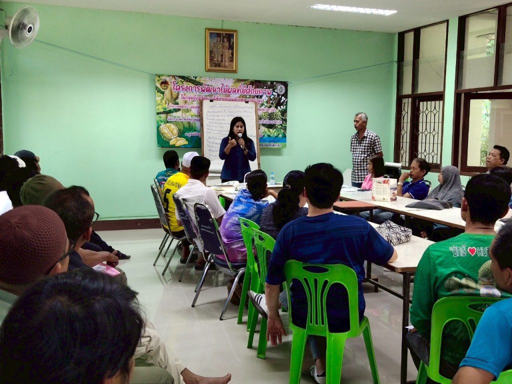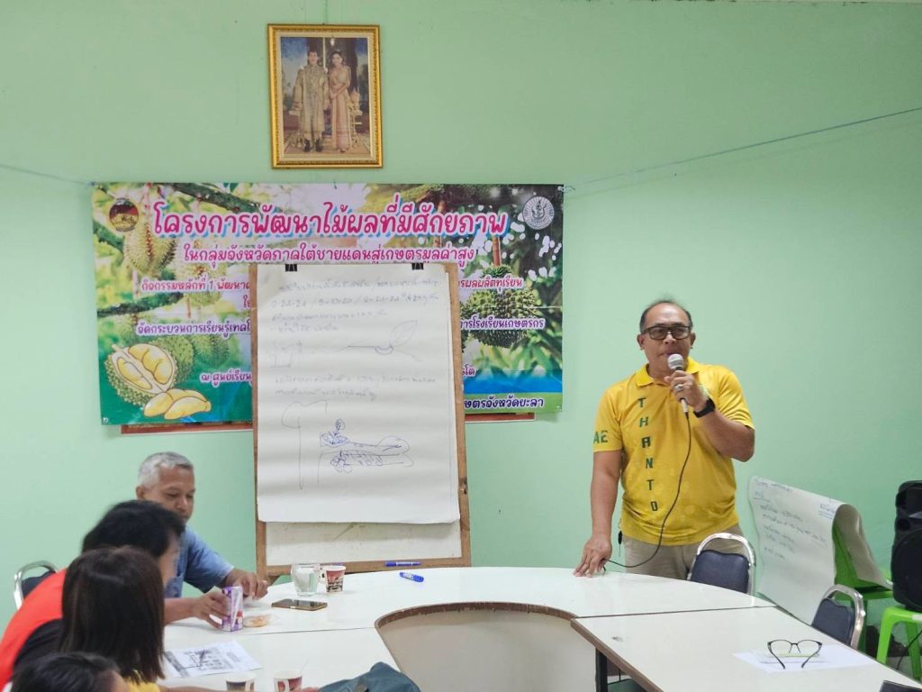วันที่ 28-29 เมษายน 2568 นายกัสมัน ยะมาแล เกษตรจังหวัดยะลา มอบหมายให้เจ้าหน้าที่กลุ่มส่งเสริมและพัฒนาการผลิต สำนักงานเกษตรจังหวัดยะลา พร้อมด้วยเกษตรอำเภอธารโต และเจ้าหน้าที่สำนักงานเกษตรอำเภอธารโต ดำเนินการจัดกระบวนการเรียนรู้เทคโนโลยีและพัฒนาทักษะการผลิตทุเรียนตามกระบวนการโรงเรียนเกษตรกร กิจกรรมพัฒนาศักยภาพการผลิต การแปรรูป และการบริหารจัดการผลผลิตทุเรียนให้ได้มาตรฐานตลอดห่วงโซ่คุณค่าการผลิต โครงการพัฒนาไม้ผลที่มีศักยภาพในกลุ่มจังหวัดภาคใต้ชายแดนสู่เกษตรมูลค่าสูง เพื่อพัฒนาเกษตรกรผู้ปลูกทุเรียนให้มีความรู้การผลิตทุเรียน ให้ได้มาตรฐาน มีคุณภาพ และเป็นที่ยอมรับแก่ผู้บริโภค ตลอดจนการจัดการผลิตทุเรียนตามห่วงโซ่อุปทาน โดยได้รับเกียรติจากนายสุริยันต์ จันทรมณี ประธานกลุ่มวิสาหกิจชุมชนทุเรียนคุณภาพนาปางเป็นวิทยากรบรรยาย การดูแลทุเรียนระยะเจริญของผล การฝ่าวิกฤติการผลิตทุเรียนต่อสภาพอากาศแปรปรวน การดูแลจัดการสวน การจัดการเก็บเกี่ยวและหลังเก็บเกี่ยว การใช้สารเคมีที่ถูกต้อง โดยมีเกษตรกรผู้ปลูกทุเรียนจำนวน 35 ราย ณ สำนักงานเกษตรอำเภอธารโต และแปลงเรียนรู้การผลิตทุเรียนคุณภาพตามมาตรฐาน ในพื้นที่ตำบลธารโต อำเภอธารโต จังหวัดยะลา