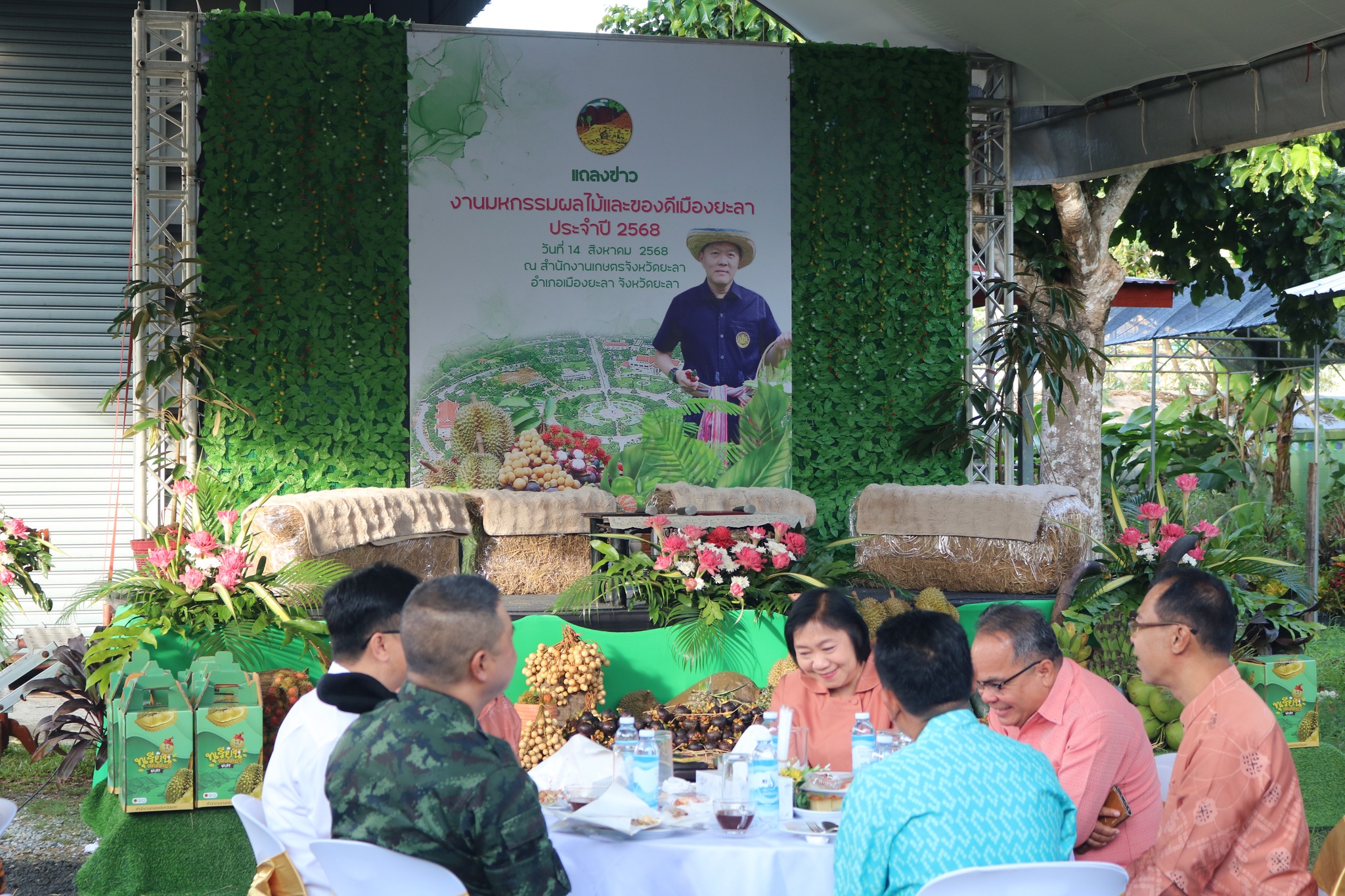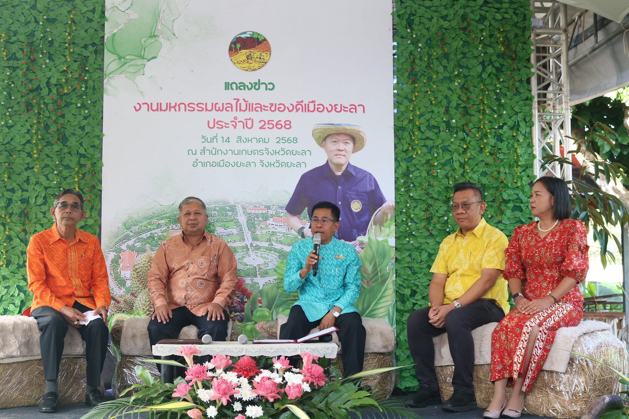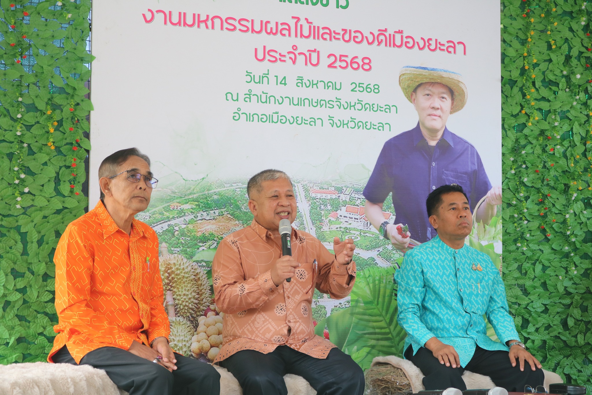 วันที่ 14 สิงหาคม 2568 นายอำนาจ ชูทอง รองผู้ว่าราชการจังหวัดยะลา พร้อมด้วยนายกัสมัน ยะมาแล เกษตรจังหวัดยะลา นายวิศาล จิรภาพงพันธ์ รองนายกเทศมนตรีนครยะลา ดร.ระเด่น สะมะแอ รองนายกองค์การบริหารส่วนจังหวัดยะลา และนางสุนิสา อยู่หนูสิงห์ วัฒนธรรมจังหวัดยะลา ร่วมกันแถลงข่าวการจัดงานมหกรรมผลไม้และของดีเมืองยะลา ประจำปี 2568 ณ สำนักงานเกษตรจังหวัดยะลา อำเภอเมืองยะลา จังหวัดยะลา ทั้งนี้ หลังงานแถลงข่าวฯ ได้มีการจัดกิจกรรมพบปะยามเช้า เพื่อแลกเปลี่ยนข้อคิดเห็นปรึกษาหารือข้อราชการต่าง ๆ ในการปฏิบัติงานของส่วนราชการและสร้างความสัมพันธ์อันดีต่อกัน