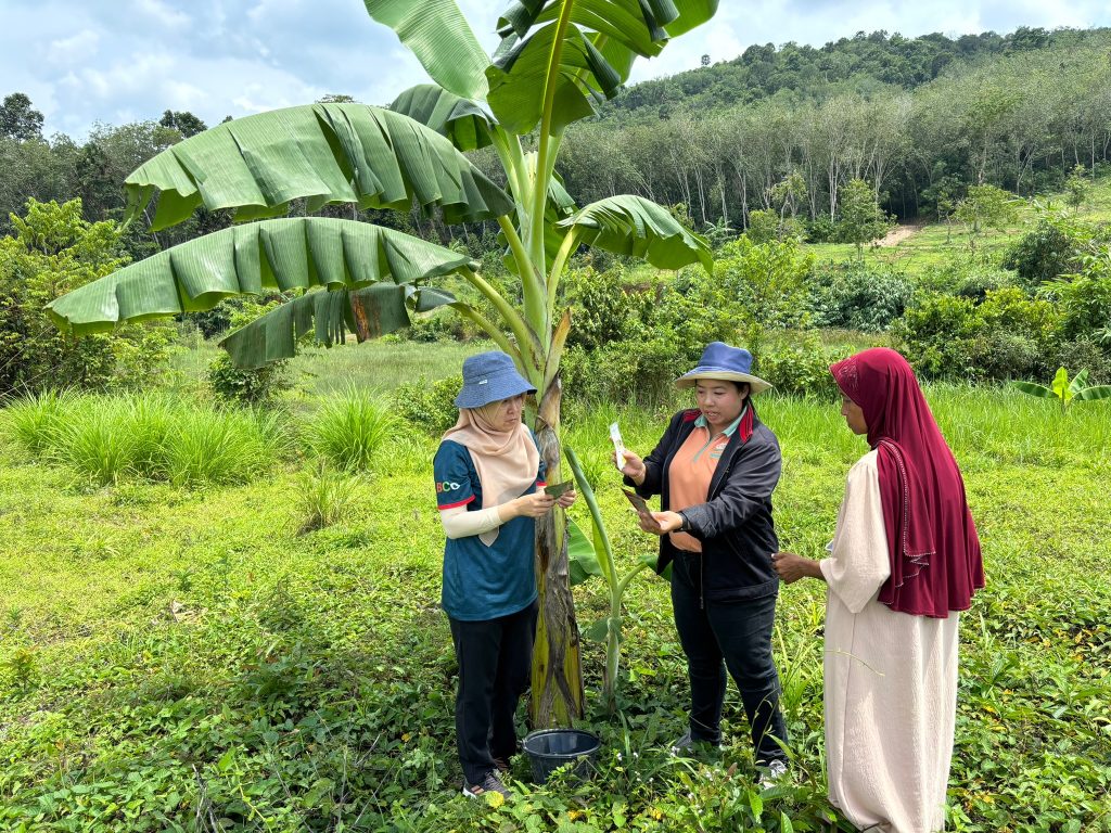 วันที่ 10 ตุลาคม 2567 นายอับดุลญาลีล บูระพา เกษตรอำเภอยะหา มอบหมายให้เจ้าหน้าที่สำนักงานเกษตรอำเภอยะหา ติดตามแปลงปลูกกล้วยหินของนางอาไอเสาะ มามะ เกษตรกรหมู่ที่ 2 ตำบลบาโร๊ะ อำเภอยะหา จังหวัดยะลา พร้อมมอบปัจจัยการผลิต ทั้งนี้ได้แนะนำเกษตรกรเรื่องการป้องกันกำจัดโรคเหี่ยวในกล้วยหิน เน้นย้ำในเรื่องการใช้สารชีวภัณฑ์ Bs และไตรโคเดอร์มา อย่างต่อเนื่อง หมั่นตัดแต่งทางใบ และแนะนำเรื่องการใส่ปุ๋ยเคมี และปุ๋ยอินทรีย์ เพื่อบำรุงต้น สร้างความสมบูรณ์ของต้นกล้วย