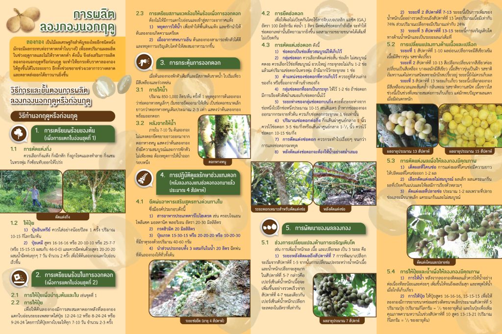 ลองกอง เป็นไม้ผลเศรษฐกิจสำคัญของไทยอีกชนิดหนึ่ง มักจะมีผลกระทบต่อราคาตกต่ำในบางปี เพื่อลดปริมาณผลผลิตในช่วงฤดูกาลและไม่ให้ราคาตกต่ำ ดังนั้น จึงส่งเสริมการผลิตลองกองนอกฤดูหรือก่อนฤดู จะทำให้ยกระดับราคาลองกองให้สูงขึ้นได้ในระยะยาว อีกทั้งช่วยขยายช่วงเวลาการวางตลาดและตลาดส่งออกได้ยาวนานยิ่งขึ้น รายละเอียดดังภาพข้างล่างนี้
