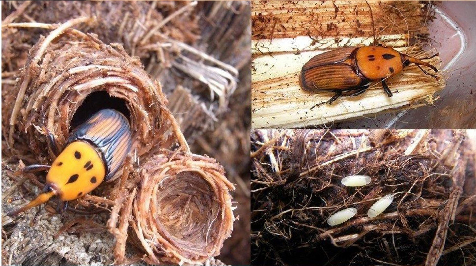 1. ต้นมะพร้าวที่ถูกด้วงงวงชนิดใหญ่ทำลาย ควรตัดโค่นทอนเป็นท่อนแล้วผ่าจับหนอนทำลาย