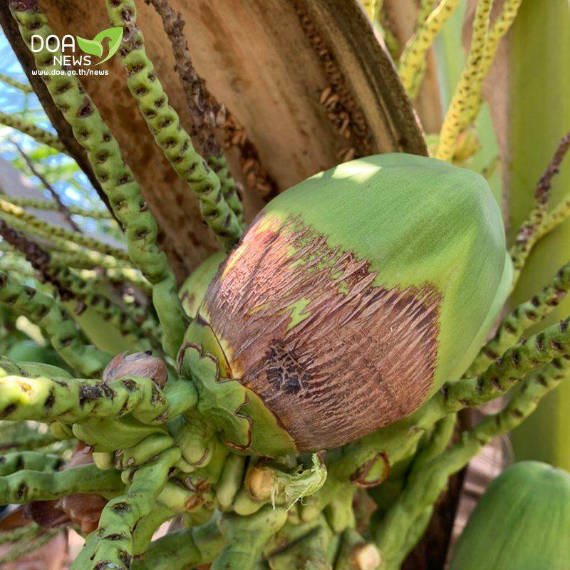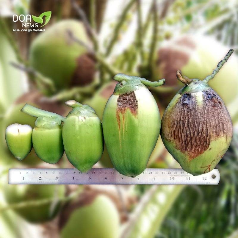 ผลมะพร้าวที่ถูกไรสี่ขาทำลายจะชะงักการเจริญเติบโต หลุดร่วงและผลผลิตเสียหายได้ถึง 70% จึงต้องเร่งสร้างการรับรู้ให้เกษตรกรชาวสวนมะพร้าวเฝ้าระวังเนื่องจากสร้างความเสียหายอย่างรุนแรงต่อทั้งคุณภาพและผลผลิตมะพร้าว