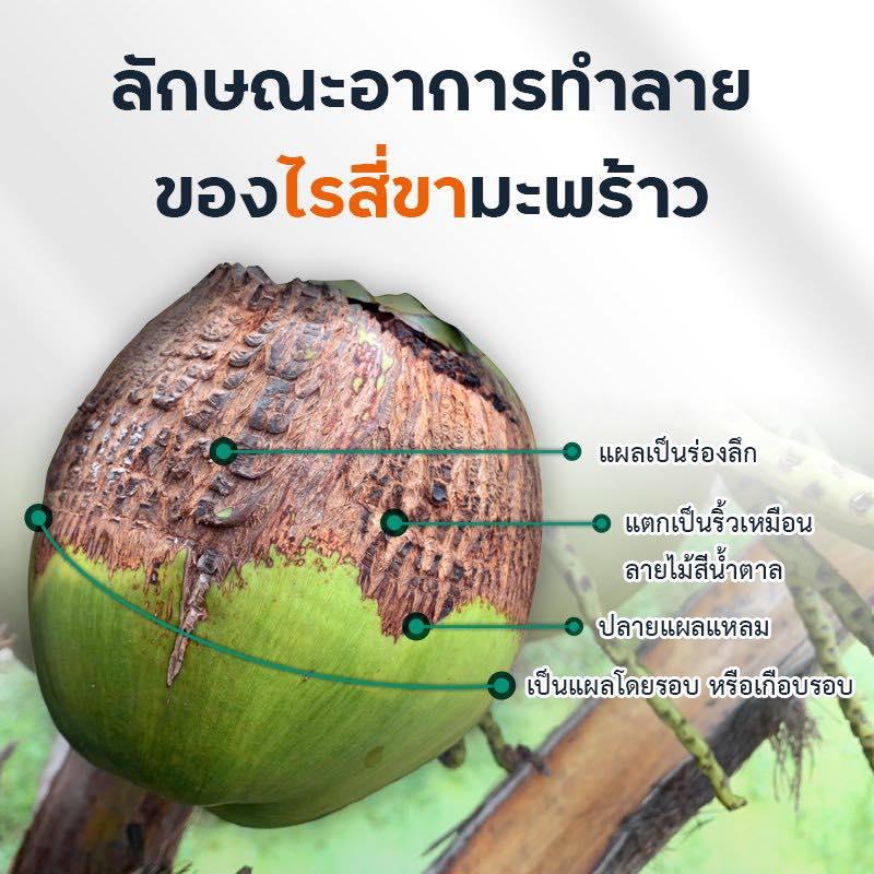 ไรสี่ขามะพร้าวเป็นศัตรูพืชที่เข้าทำลายอยู่ภายในขั้วผลมะพร้าว ทำให้การพ่นสารฆ่าไรไม่สามารถโดนตัวไรได้โดยตรง