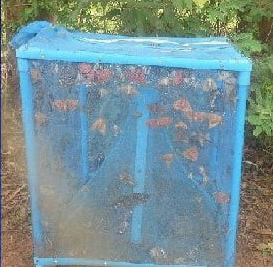 4. ใช้กรงดักจับผีเสื้อมวนหวาน ทำด้วยมุ้งลวดทั้ง 6 ด้าน ด้านล่างเจาะทำเป็นกรวยรูปฝาชี ตั้งสูงจากพื้นดินประมาณ 20-30 เซนติเมตร ใช้ผลไม้สุกเป็นเหยื่อล่อที่ด้านล่าง ผีเสื้อมวนหวานที่ลงกินผลไม้เสร็จแล้วจะบินยกต้วขึ้นและเข้าไปติดในกรง